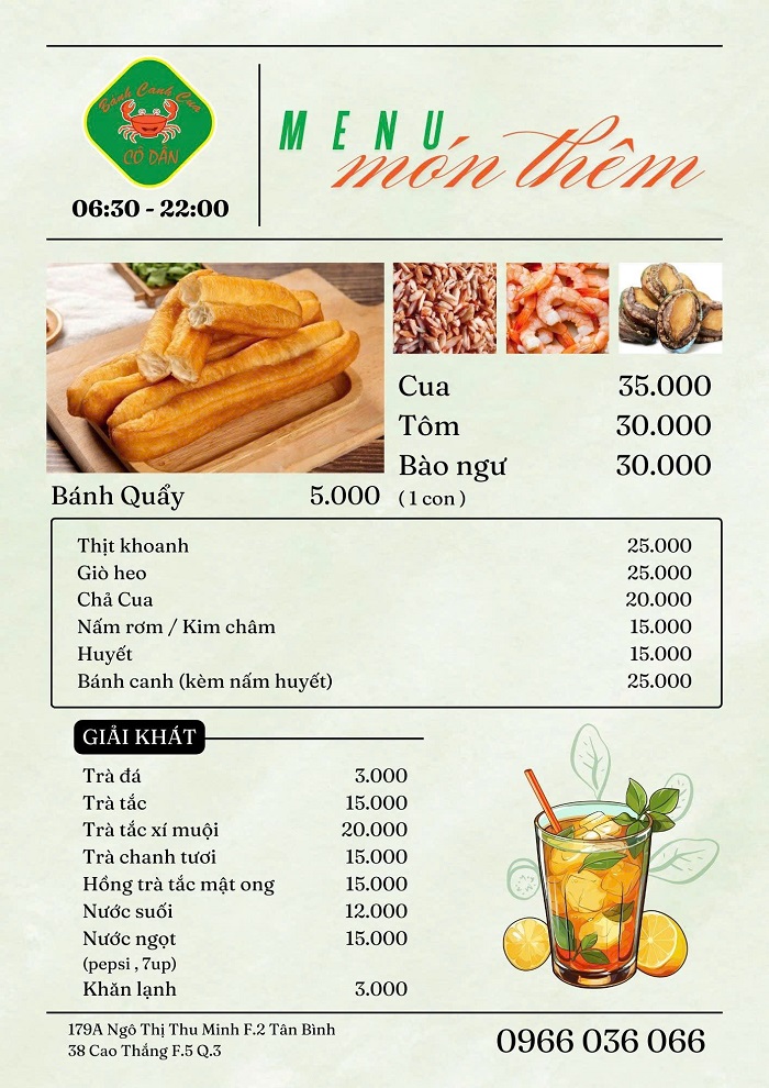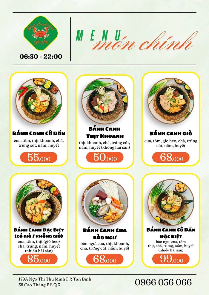 Thực đơn phong phú với các món như bánh canh thịt khoanh, bánh canh cua bào ngư, bánh canh giò heo và món đặc biệt đầy topping. Ngoài ra, bạn có thể gọi thêm tôm, cua, càng cua, trứng cút với mức giá từ 5.000 – 50.000 VNĐ/phần.