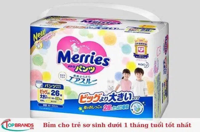 Bỉm Merries là một trong những loại bỉm cho trẻ sơ sinh dưới 1 tháng tuổi tốt nhất. Là thương hiệu bỉm cao cấp xuất xứ từ Nhật Bản, Bỉm Merries có hai loại là bỉm quần và bỉm dán với đầy đủ kích thước cho bé sơ sinh đến các bé 25 – 26kg.