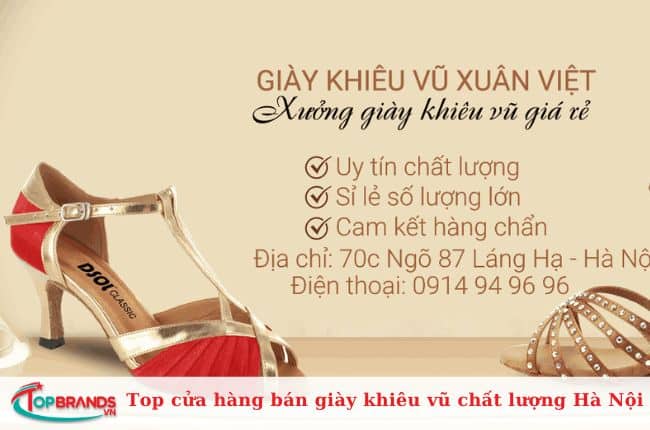Xuân Việt là đơn vị cung cấp giày khiêu vũ tại Hà Nội uy tín và chất lượng. Cửa hàng luôn cập nhật những mẫu được ưa chuộng nhất trên thị trường. Những đôi giày ở đây không chỉ có chất lượng cao mà còn đẹp, đa dạng và phong cách. Đến với giày khiêu vũ Xuân Việt bạn sẽ được đội ngũ nhân viên tư vấn nhiệt tình từ kích cỡ đến kiểu dáng, giúp bạn chọn được mẫu giày phù hợp.