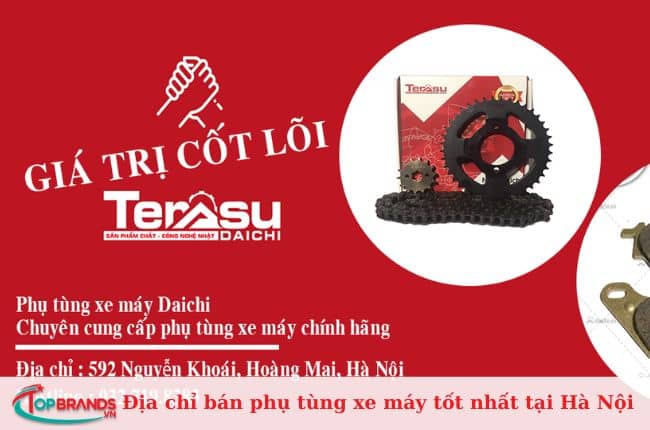 Ngay từ những ngày đầu kinh doanh phụ tùng xe máy, Daichi – Terasu luôn đặt chất lượng sản phẩm và dịch vụ lên hàng đầu. Địa chỉ bán phụ kiện xe máy Hà Nội này cam kết mang đến cho khách hàng những sản phẩm và dịch vụ với chất lượng tốt nhất và dịch vụ tốt nhất. Cho đến nay, đơn vị đã là đối tác tin cậy cung cấp phụ tùng xe máy chất lượng cao cho hàng nghìn đại lý, cửa hàng xe máy trên cả nước.
