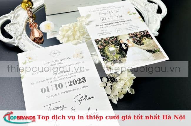 Một địa chỉ in thiệp cưới tại Hà Nội mà bạn nên tham khảo là Thiệp cưới đẹp.com. Đây là nơi được nhiều cặp đôi ở Hà Nội lựa chọn để in thiệp cưới. Với đội ngũ thiết kế tốt nghiệp từ các trường nghệ thuật uy tín và có chuyên môn cao. Bạn sẽ tìm thấy mẫu thiệp cưới phù hợp nhất. Ngoài ra, cửa hàng cũng mong muốn đầu tư trang thiết bị in ấn tốt nhất để phục vụ khách hàng.