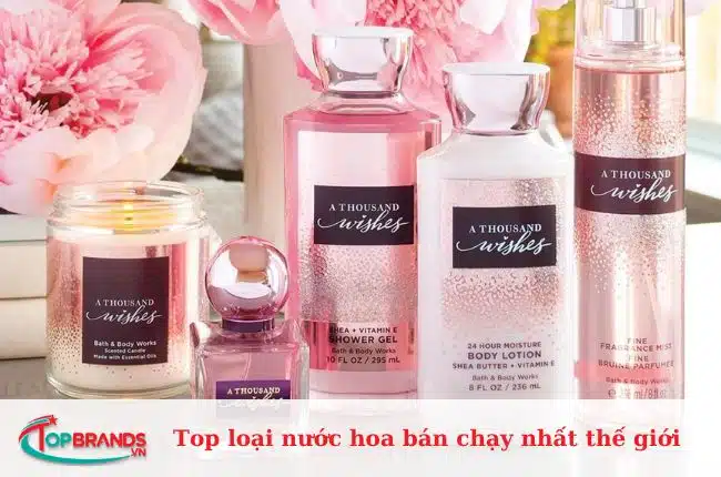 Bath & Body Works A Thousand Wishes là một body mist được yêu thích. Hương thơm kết hợp rượu vang hồng Prosecco, quả khế và quả mộc qua ở lớp đầu, tạo mùi thanh khiết và thú vị. Lớp hoa mẫu đơn và hoa lan Nam Phi thêm nồng nàn và trẻ trung. Cuối cùng, hổ phách, gỗ đàn hương và xạ hương tạo ra sự ấm áp và hoàn hảo. Nó phù hợp cho cô nàng tinh nghịch và nhí nhảnh. Thiết kế chai hình chữ nhật màu hồng nhẹ tinh tế.