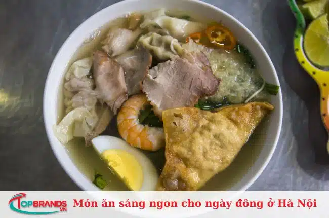 Một món ăn nữa không có nguồn gốc từ Hà Nội nhưng lại rất được ưa chuộng tại nơi đây đó chính là mì vằn thắn. Với nước dùng đậm đà, ngọt ngào luôn làm say lòng thực khách. Một tô vằn thắn đầy ắp sủi cảo, há cảo, miếng tiết, miếng bóng, vài miếng thịt xá xíu khiến thực khách không thể từ chối. Có nơi, tô mì còn được thêm vài con tôm và cong cong vừa ngon vừa bổ dưỡng. Còn gì tuyệt vời hơn khi được thưởng thức một tô mì vằn thắn vào sáng sớm.