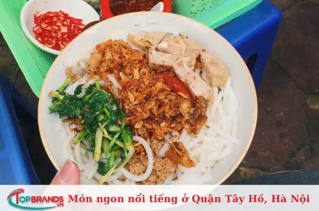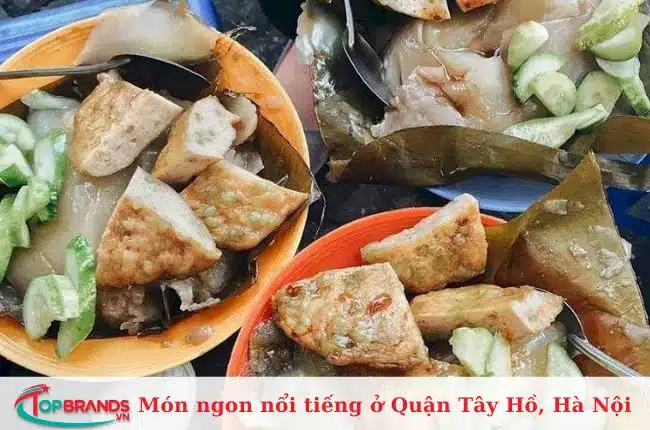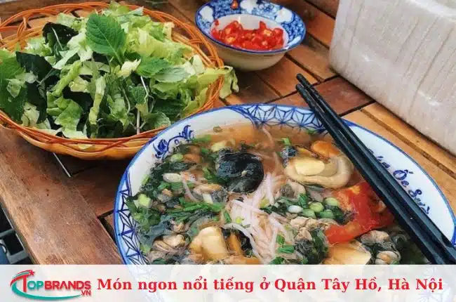 Bún ốc là một trong những món ăn ngon ở quận Tây Hồ đơn giản nhưng đầy tinh tế và tỉ mỉ trong từng chi tiết. Nước dùng chua chua, thêm một chút cay cay từ ớt chưng, kết hợp với vị béo ngậy của ốc và vị bùi bùi của đậu phụ, tạo nên hương vị đặc biệt cho món ăn này.