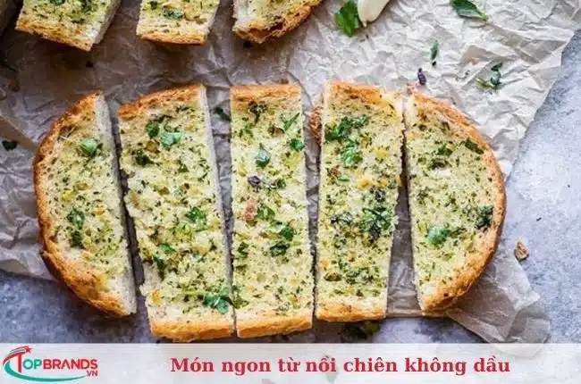 Bánh mì bơ tỏi cũng là ứng cử viên sáng giá góp mặt trong danh sách các món ngon từ nồi chiên không dầu. Nguyên liệu gồm bánh mì, bơ, muối tiêu, rau mùi, tỏi.
