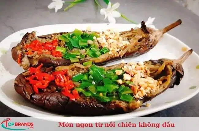 Món cà tím nướng mỡ hành cũng được nhiều người yêu thích. Bạn bổ dọc quả cà tím rồi làm thêm chén mỡ hành. Thoa lớp mỡ hành lên trái cà tím rồi xếp vào nồi chiên không dầu.