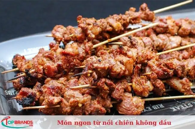 Thịt xiên nướng là món ngon từ nồi chiên không dầu được làm bằng thịt lợn được nhiều người yêu thích. Nguyên liệu gồm thịt nạc vai, hành tỏi băm, mật mía, dầu hào, hạt nêm, tiêu, nước mắm, dầu mè, dầu ăn,nước màu.