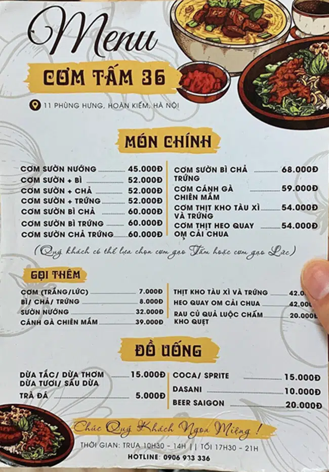 Cơm tấm 36 được biết đến là địa chỉ bán cơm ngon và nức tiếng tại đất Hà thành. Điểm thu hút lớn nhất tại quán nằm ở giá trị thương hiệu và đội ngũ đầu bếp chuyên nghiệp. Món ăn được nấu với công thức chuẩn vị, riêng biệt tạo nên mùi thơm và độ hoàn hảo khó cưỡng.