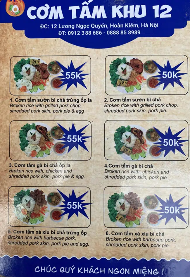 Được đánh giá là một trong những quán cơm tấm ở Hà Nội chuẩn vị Beer Khu 12 không chỉ được đánh giá cao về hình thức mà còn đem đến giá trị dinh dưỡng cao. Do đó, lượng khách ghé đến quán rất đông, nhất là những giờ ăn trưa và tối. Không gian quán khá rộng và có rất nhiều chỗ ngồi nên bạn có thể rủ bạn bè và người thân ghé đến thưởng thức.