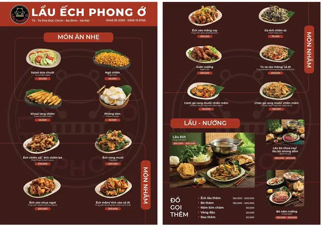 Nếu bạn cũng là một tín đồ của món lẩu ếch hãy ghé ngay đến quán Phong Ớ nằm ở quận Ba Đình. Tất cả món ăn tại quán có giá dao động từ 200.000 đồng đến 500.000 đồng cho khách hàng lựa chọn. Một combo thông thường bao gồm nước lẩu đậm đà, 1 đĩa ếch xào lá lốt và 1 địa da ếch chiên giòn.