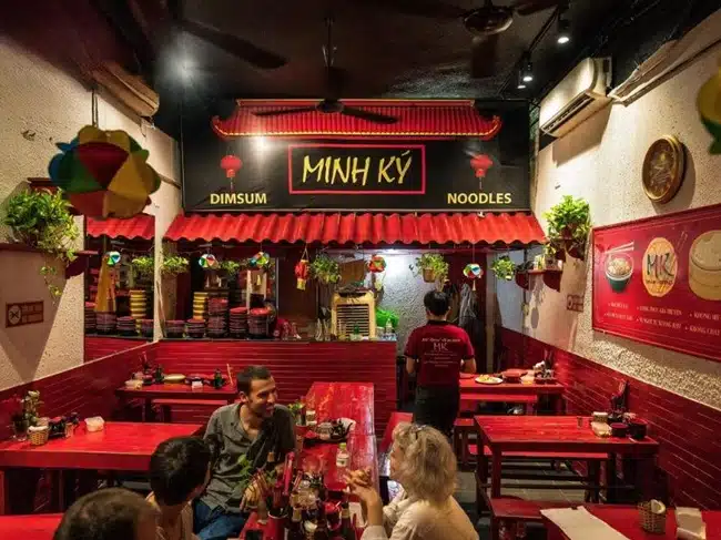 Minh Ký Dimsum và Noodles là quán chuyên phục vụ đồ ăn Hồng Kông với hương vị độc đáo của đồ ăn. Khi bước chân vào quán, người ta sẽ ngay lập tức chìm đắm trong không khí độc đáo với cửa và biển hiệu phô trương màu đỏ chót, tạo điểm nhấn nổi bật giữa phố thị. Bên trong, không gian tiếp tục lôi cuốn với màu đỏ ấm áp, đem lại cảm giác thân thuộc và mang đậm dấu ấn Hồng Kông. Quán không chỉ là nơi dừng chân để thưởng thức mì vịt quay ngon miệng và chất lượng tại Hà Nội, mà còn là hành trình khám phá mỹ quan độc đáo của đồ ăn đường phố tại thủ đô.
