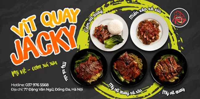 Nổi tiếng tại Hà Nội và chuyên phục vụ các món cơm và mỳ đó là thương hiệu vịt quay Jacky. Tại quán, có rất nhiều món ăn được đông đảo khách hàng yêu thích đó là mì vịt quay, mì vịt xá xíu. Sợi mì được dùng rất to nấu với độ vừa phải và có độ dai vừa phải. Thịt vịt được chế biến ngon ngọt tự nhiên cùng gia vị đưa miệng. Điểm đặc biệt khác ở món ăn này còn ở nước sốt mì sánh mịn thơm ngon và bắt mắt. Khi ăn món ăn này tại quán, do nước sốt được chế biến thiên về ngọt nên bạn có thể nhắc nhở nhân viên cho ít nước sốt để có được một tô mì hoàn hảo.
