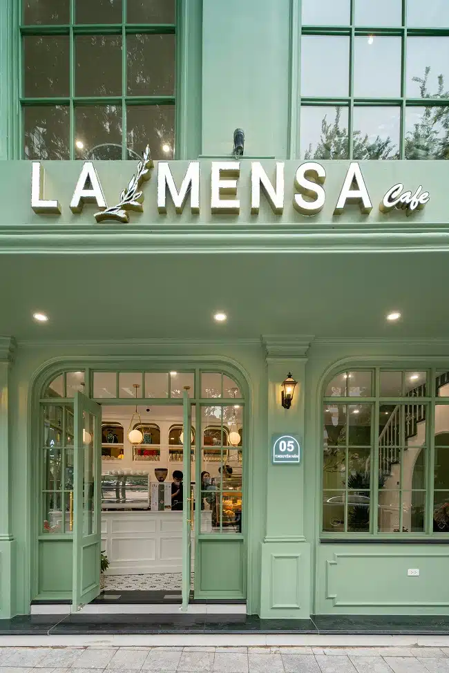 Quán La Mensa với tông màu xanh lá nhẹ nhàng nằm trong ngõ lớn, có một tầng rộng rãi và khu vực để xe phía trước. Không gian được chia thành nhiều khu vực, nhưng kính lớn ngăn cách giúp tạo cảm giác thoáng đãng và ánh sáng tự nhiên rực rỡ. La Mensa tận dụng không gian một cách tinh tế, tạo ra không gian riêng tư trong nhà phù hợp cho làm việc, trong khi hành lang ngoài trời mang đến không khí chill hơn, với ánh sáng đẹp và gương chụp ảnh hoàn hảo. Đây là địa điểm lý tưởng cho những bạn muốn sống ảo và thưởng thức trà bánh, đặc biệt là những bạn nữ diện váy.