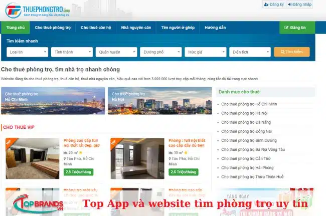 Một trang Web tìm phòng trọ uy tín tiếp theo mà Topbrands không muốn bạn bỏ qua đó là Thuephongtro.com. Website này gồm có rất nhiều tiện ích như: cho thuê nhà trọ, phòng trọ, nhà nguyên căn, tìm người ở ghép, cho thuê căn hộ,… Do đó, bạn hoàn toàn có thể dễ dàng tìm được hình thức thuê trọ mà mình mong muốn.