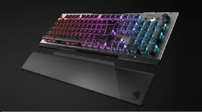 Gợi ý cuối cùng dành cho các gamer đó là bàn phím cơ Roccat Vulcan 120 AIMO. Sản phẩm này được các game thủ lựa chọn khi tham gia vào những trận đấu giải. Dòng bàn phím này sở hữu thiết kế hiện đại, sang trọng cùng màu Per-key RGB sáng bắt mắt với nút xoay tiện lợi.