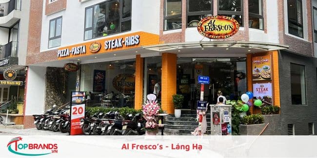 Có mặt tại Việt Nam từ năm 1996, sau hơn 20 năm phát triển – Al Fresco’s đã trở nên nổi tiếng trên thị trường Việt Nam với nhiều thương hiệu nổi tiếng như: Pepperonis, Steakhouse, Hot n Tasty, Jaspas, Jacksons,… và đặc biệt là thương hiệu The Al Fresco’s được nhiều thực khách trong và ngoài nước ưa chuộng. Đến với Al Fresco’s nói chung và Al Fresco ở Láng Hạ bạn sẽ được nếm thử những hương vị Âu Á đặc trưng và độc đáo như: Pizza, Spaghetti, Sườn nướng sốt BBQ. , Burger, món Mexico, bánh sô cô la nướng chảy,…