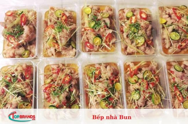Chân gà sả ớt tại Bếp nhà Bun là những chiếc chân gà to, được cắt khúc khéo léo, chân gà rút xương được loại bỏ và chế biến cẩn thận, hợp vệ sinh. Chân gà giòn giòn, thấm đẫm vị chua cay, nước chấm nổi tiếng được thực khách ưa chuộng.