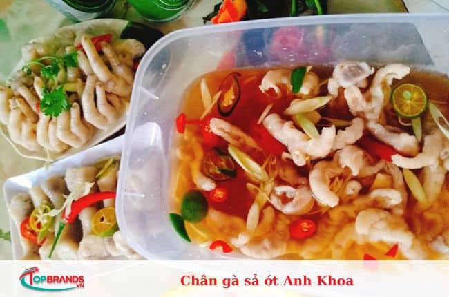 Chân gà sả ớt Anh Khoa Với thành phần là đùi gà to giòn dai cùng gia vị đậm đà thấm vào chân gà. Qua quá trình chế biến các món ăn sạch, hấp, ngâm sả ớt để ngấm gia vị, những chiếc đùi gà vàng óng, mịn màng và sáng bóng sẽ được bày ra đĩa phủ sả ớt băm nhỏ. vị thơm của nước chấm khá hòa quyện, vị cay của sả ớt, độ giòn của từng miếng đùi gà.