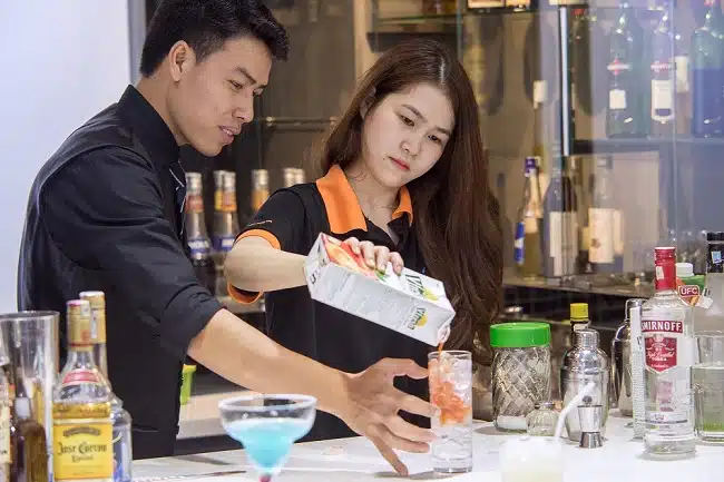 - Bartender: Phong cách Bartender, sử dụng các công cụ chuyên ngành, quy trình quản lý bar, quy trình và nghệ thuật pha Cocktail,…