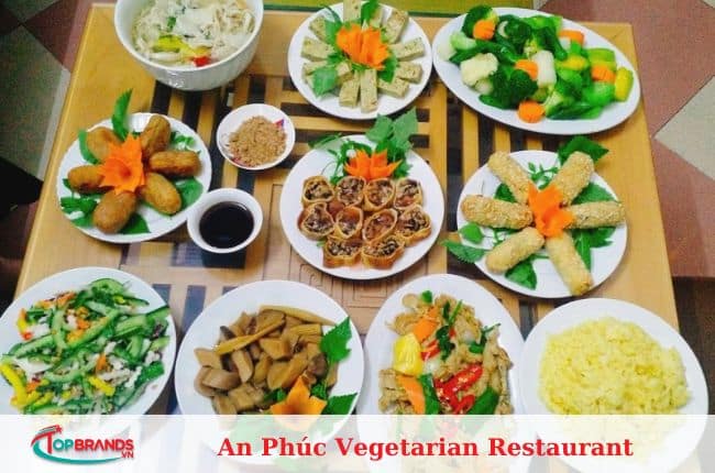 Một đĩa chay thường có từ 10 đến 12 món, được thay đổi theo từng mùa. Đĩa cơm chay Phúc đầy ắp các món: gà hấp, tôm chiên, nem rán, nem chua, bánh lọc, canh nấm… được trình bày đẹp mắt như một món mặn. Ngoài dịch vụ gọi món, Nhà hàng Chay An Phúc còn phục vụ các món chay tại chỗ với thực đơn đa dạng, trong đó có món Lẩu chay tươi mềm.