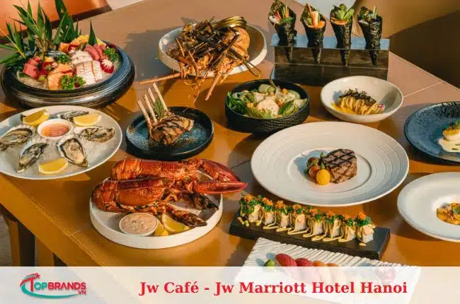 JW Café nằm bên trong khách sạn JW Marriott là một trong những nhà hàng buffet 5 sao nổi tiếng ở Hà Nội. Bữa trưa ở đây bắt đầu từ 12h đến 15h với đầy đủ các món ăn từ nhiều nước, từ châu Á đến châu Âu. Với 6 quầy bếp mở phục vụ các món ăn cao cấp như tôm hùm, gan ngỗng và hàu Pháp, bạn sẽ có trải nghiệm ẩm thực ấn tượng với bữa sáng muộn tại JW Café.