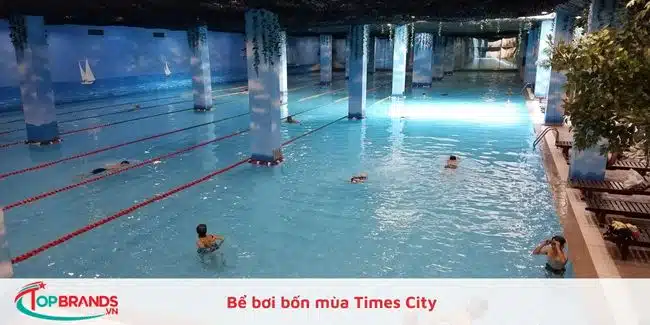 Bể bơi người lớn có diện tích 1400 m2, chiều dài 56 m, diện tích còn lại dành cho bể bơi thiếu niên và trẻ em có độ sâu lần lượt là 0,9 m và 0,5 m. Bể bơi bốn mùa trong tiêu đề đã nói lên tất cả: Times City có hệ thống làm ấm hiện đại tại đây, đáp ứng mọi nhu cầu bơi lội của khách hàng quanh năm. Bể bơi còn có đội ngũ huấn luyện viên, kỹ thuật viên có năng lực, giàu kinh nghiệm để dạy bơi cho khách hàng cũng như nhiều dịch vụ chăm sóc khách hàng như cho thuê đồ bơi, khăn tắm, đồ ăn nhẹ, ghế nghỉ ngơi,…