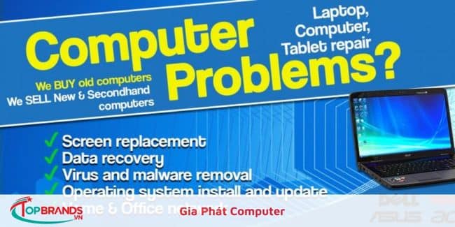Gia Phát Computer chuyên cung cấp dịch vụ sửa chữa máy tính chất lượng, uy tín, giá rẻ với đội ngũ thợ lành nghề và giải quyết sự cố nhanh chóng, an toàn, triệt để với sự nhiệt tình. Gia Phát sửa chữa, giải quyết mọi sự cố máy tính cho tất cả các hãng máy tính trên thị trường. Từ những sự cố đơn giản như cài Windows trên máy tính cho đến những sự cố nghiêm trọng hơn như máy tính không lên, bật lên nhưng màn hình không hiển thị, ổ cứng máy tính bị hỏng…Luôn luôn sửa chữa máy tính kịp thời, khắc phục sự cố cẩn thận, đảm bảo máy tính hoạt động bình thường.