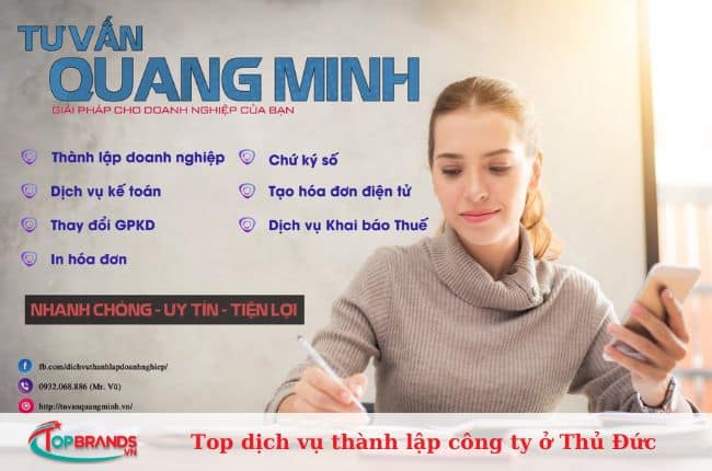 Tư Vấn Quang Minh đã là cái tên quá đỗi quen thuộc dành cho những ai đang muốn tìm một công ty cung cấp dịch vụ thành lập doanh nghiệp uy tín ở Thủ Đức. Đến với Quang Minh, bạn sẽ nhận về những lời tư vấn chu đáo, tường tận nhất để có được một sự lựa chọn tốt nhất để mở công ty và khởi nghiệp. Đội ngũ nhân viên của Quang Minh sẽ giúp bạn giải quyết mọi khó khăn về thủ tục và pháp lý, chi phí duy trì công ty hàng tháng. Nhờ đó mà bạn có thể tiết kiệm thời gian và công sức để tập trung vào nhiều công việc quan trọng hơn trong tương lai.