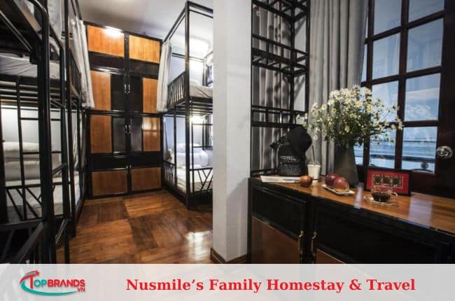 Nusmile’s Family Homestay & Travel cung cấp nhiều loại phòng đa dạng, từ giường đơn đến phòng tập thể. Hầu như phòng nào cũng có ban công để căn phòng đón được nhiều gió và không khí hơn. Có một vài chậu cây treo trên song sắt, tạo nên bầu không khí rất lạnh lẽo và giản dị. Ngoài ra, trên ban công, chủ nhà còn đặt một số ghế nhỏ để du khách ngắm nhìn những con hẻm nhỏ của phố cổ Hà Nội.