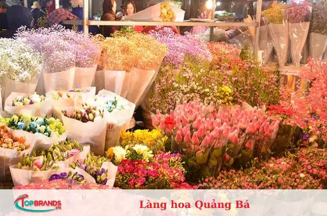 Làng hoa Quảng Bá chỉ cách Hồ Tây khoảng 1 km. Đây là làng hoa nổi tiếng ở Hà Nội, đặc biệt nhộn nhịp vào những ngày cận Tết. Chỉ cần đi dọc bờ sông Hồng, bạn sẽ thấy một vườn quất trĩu quả, từng cây được cắt tỉa, tạo hình tỉ mỉ. Để mua quất Tết bạn hãy đến thẳng chợ Quảng Bá và có thể chọn những cây trái to, đẹp, còn nhiều hoa, nụ tươi tốt.