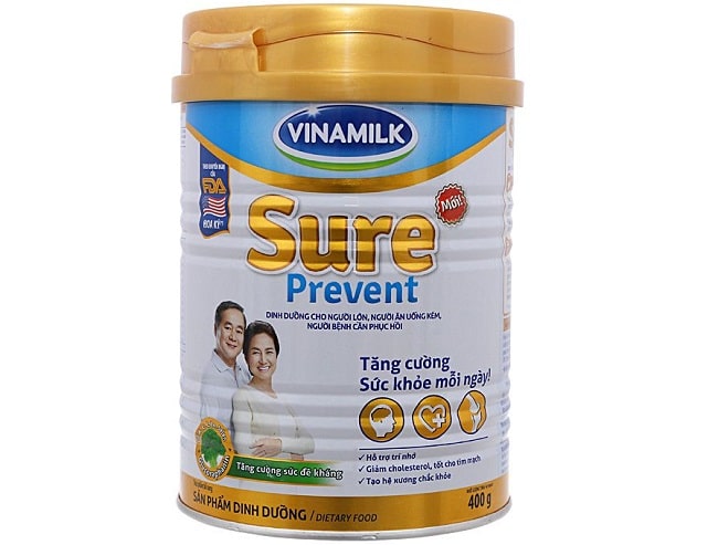 Đến từ Vinamilk, sữa Sure Prevent là một trong những sản phẩm sữa bổ sung canxi cho người già hàng đầu tại Việt Nam. Với hơn 20 năm có mặt trên thị trường, sản phẩm này đã có được sự tin tưởng của người tiêu dùng. Sữa Sure Prevent có chứa nhiều loại vitamin, chất đạm, chất béo, canxi, carbohydrate, PUFA, MUFA…