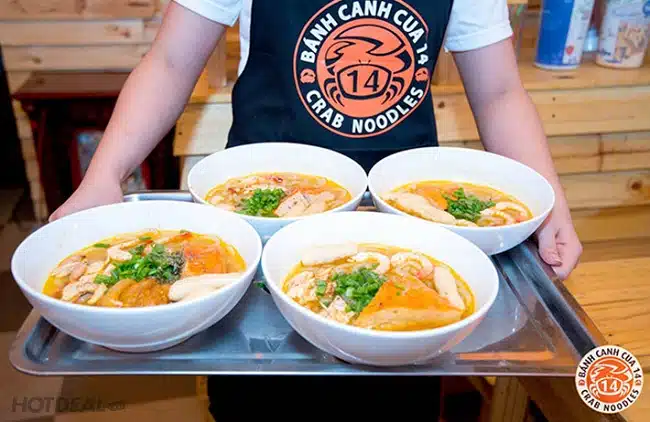 Bánh canh cua 14 có không gian quán khá rộng rãi với thiết kế 2 tầng rất mát mẻ. Đặc sản của quán chính là bánh canh cua. Chả cua và thịt cua được quán chế biến rất ngon, mùi thơm khó cưỡng làm cho thực khách khó quên khi đã thưởng thức bánh canh cua ngon tại đây. Nhân viên phục vụ rất thân thiện, nhiệt tình với khách.