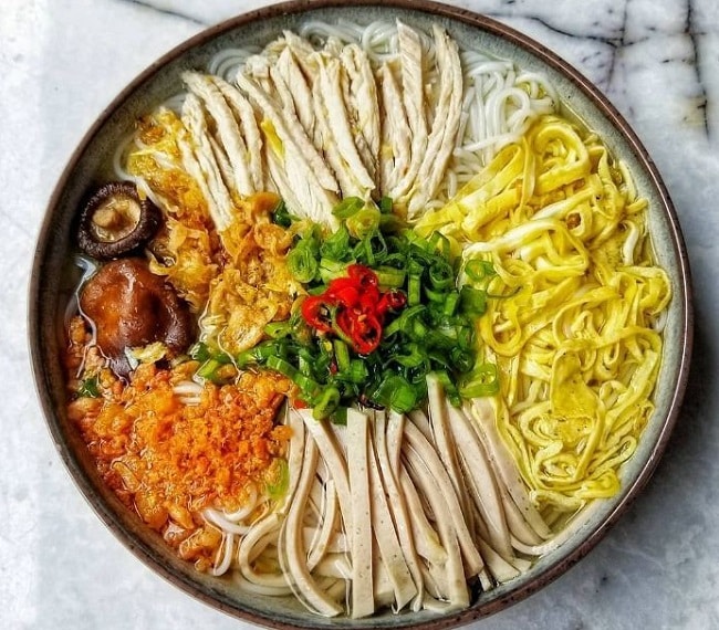 Bún thang Hà Nội được mệnh danh là “đệ nhất cầu kỳ” vì cần dùng đến 20 nguyên liệu để làm ra tô bún thơm ngon. Thành phần chính bao gồm: trứng gà chiên mỏng xắt nhỏ, lườn gà xé phay, giò lụa xắt mỏng, tôm, mực, rau răm, v.v… tất cả tạo nên một tô bún sắc màu bắt mắt và tạo cảm giác ngon miệng. Quả xứng đáng là món ngon Hà Nội nổi bật và đáng để thưởng thức.