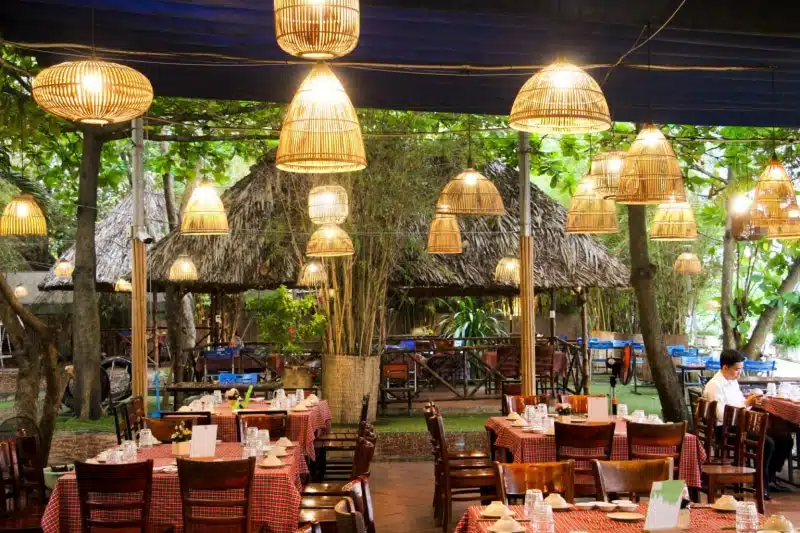 Nhà hàng Sân Vườn Bên Sông Kha Vạn Cân nổi tiếng với không gian ăn uống yên bình, thích hợp để tổ chức tiệc tùng, họp mặt gia đình, gặp gỡ đối tác. Menu quán đa dạng các món ăn dân dã mang hương vị ẩm thực 3 miền như: gà hấp lá sen, tôm mù tạt, cơm xanh,…mà giá cả lại rất phải chăng, hoàn toàn xứng đáng với giá tiền mà bạn bỏ ra. Đặc biệt, nhà hàng còn bố trí nhiều khu vực ăn uống kiểu chồi lá với không gian mở tạo cảm giác riêng tư cho thực khách mà vẫn đón luồng gió tự nhiên rất mát mẻ.