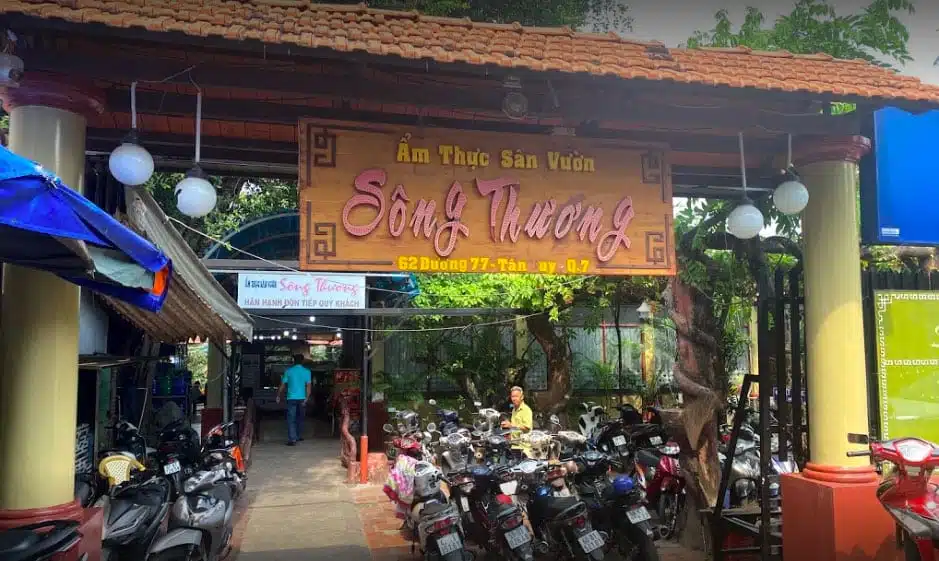 Ẩm thực sân vườn Sông Thương là một trong số những nhà hàng ven sông Sài Gòn quen thuộc của nhiều tín đồ ẩm thực. Quán sở hữu không gian sân vườn độc đáo với nhiều góc view hướng bờ sông mát mẻ, thoáng đãng. Từ đó giúp khách hàng cảm thấy thoải mái, dễ chịu khi ăn uống tại đây. Còn thực đơn quán được đánh giá cao với vô vàn các món ăn có giá cả rất phải chăng. Một số món best seller của quán mà bạn nhất định phải thử khi đến đây đó là như gà quay lu, cá mú biển, tôm nướng muối,…