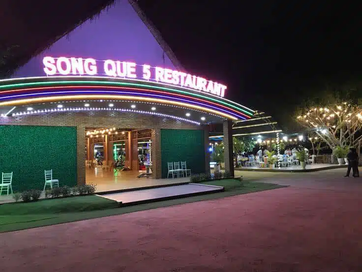Ẩm Thực Sinh Thái Sông Quê 5 nằm ở vị trí ven bờ sông Sài Gòn, được bố trí các khu vực bàn ăn hợp lý để thực khách có thể chiêm ngưỡng toàn cảnh vẻ đẹp của con sông lớn trong thành phố. Mặc khác, nhờ sở hữu diện tích khá lớn, không gian được trang trí rất logic tạo nên bầu không khí thoáng đãng, mát mẻ cho thực khách khi dùng bữa tại đây. Thực đơn của quán rất đa dạng với nhiều món ăn dân dã, điển hình là ếch thui rom, tôm càng lóng, gò heo muối chiên giòn,…rất được thực khách yêu thích.