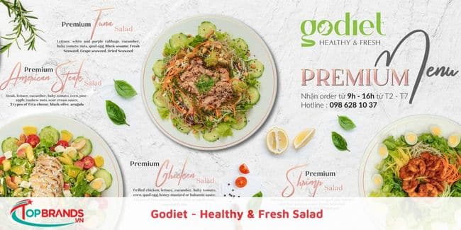 Godiet – Healthy & Fresh Salad là nơi những tín đồ eat clean có thể thưởng thức đồ ăn, thức uống và các món ăn vặt mà không lo bị tăng cân. Cửa hàng chuyên cung cấp các bữa ăn lành mạnh theo tiêu chuẩn của chế độ Low GI Diet đảm bảo sức khỏe, giảm mỡ thừa và đặc biệt thơm ngon, đẹp mắt. Chế độ ăn của GoDiet được thiết kế đặc biệt để đảm bảo các chất dinh dưỡng thiết yếu, hoàn toàn không chứa carbohydrate và chất béo xấu. Từ đó, kết quả mà bạn chắc chắn sẽ nhận được sau một chế độ ăn kiêng nghiêm ngặt là một cơ thể khỏe mạnh không thừa mỡ.