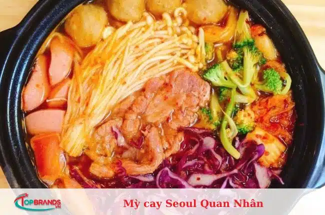 Một món ăn khác cũng khá nổi tiếng khi trời bắt đầu chuyển sang mùa lạnh, đó chính là mì cay. Nếu muốn thưởng thức món mì cay nóng để làm ấm cơ thể thì hãy đến với Mỳ cay Seoul Quan Nhân. Menu của quán rất đa dạng, có thể kể đến như: mì cay 7 cấp độ, Lẩu thái tôm yum, lẩu kim chi thập cẩm,.. Có các món cay nóng thì không thể nào thiếu những loại đồ uống: Trà sữa, trà đào, Soda, pessi, coca…
