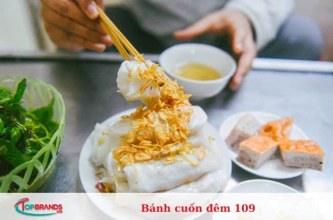 Bánh cuốn đêm 109 nằm trong một con ngõ của đường Tôn Đức Thắng nhưng lúc nào cũng có khách ra vào. Khách gọi đến đâu sẽ đổ bánh đến đấy, chính vì vậy mà bánh khi đến tay khách hàng vẫn còn nóng hổi, nhân thịt nhiều. Trải bên ngoài là hành phi, ăn kèm với chả lụa, rau thơm ăn kèm với nhau, chỉ cần cắn một miếng là sẽ cảm nhận được sự thơm ngon, chất lượng.