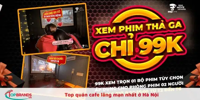 Cine Cafe là một quán cafe tích hợp với rạp chiếu phim thích hợp cho những buổi hẹn hò lãng mạn của cặp đôi. Đến đây, bạn và nửa kia sẽ được trải nghiệm những bộ phim đình đám không còn chiếu ở rạp phim nữa trong một không gian riêng, vừa lãng mạn vừa ấm cúng. Bên cạnh đó, phong cách thiết kế quán đẹp cùng đồ ăn thức uống ngon mà giá cả lại hợp lý thì đây đúng là điểm đến dành cho cặp đôi.