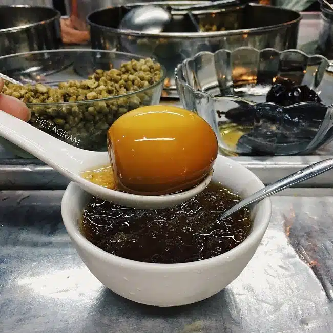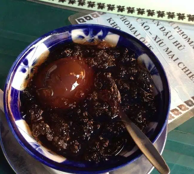 Best – seller của quán chè người Hoa Hà Ký là món chè hột gà được lòng rất nhiều thực khách. Trứng gà được làm đen cả trứng mang hương vị của người Trung Hoa, bên trong lòng đỏ cũng thấm nước trà đường nên ăn thấy có vị ngọt lợ thanh thanh nhẹ nhẹ. Bạn có thể rủ rê nhóm bạn của mình đến quán chè người Hoa này, tiện thể tán gẫu giải trí sau những giờ làm căng thẳng.