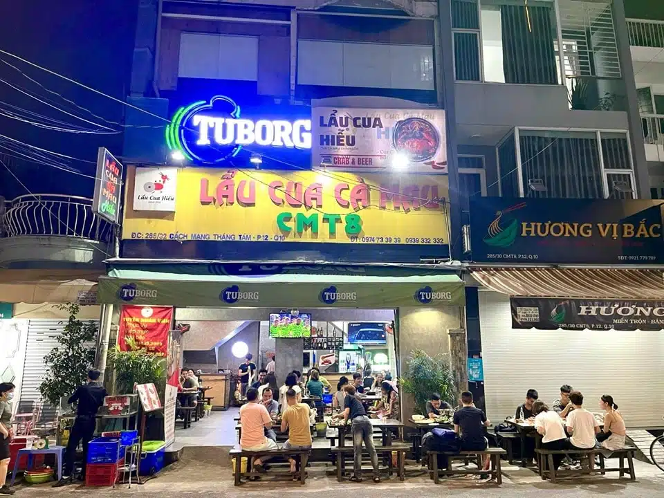 Lẩu Cua Cà Mau – Lẩu cua Hiếu (CMT8) được thực khách yêu thích bởi chất lượng tươi ngon của các món hải sản. Đặc biệt là món cua ngon “nhức nách” được chế biến theo nhiều kiểu cua sốt Singapore, gạch cua hấp, cua nấu bầu, cua sốt tiêu,…món nào cũng đầy ắp cua gạch càng ăn càng ghiền. Bên cạnh đó, không gian quán rất rộng rãi, thoáng mát, có cả phòng riêng cho hội nhóm. Chính vì thế, đây là nơi phù hợp cho những buổi tụ tập bạn bè, tiệc tùng, họp mặt gia đình,…