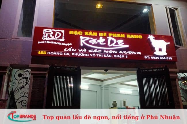 Một trong các quán lẩu dê ngon tại quận Phú Nhuận, TPHCM mà bạn không nên bỏ qua đó là Lẩu Dê Rặt Dê. Đây là điểm đến lý tưởng để bạn thưởng thức những món lẩu dê thơm ngon, bổ dưỡng nhất. Với thái độ phục vụ chu đáo, nhiệt tình, quán đã xây dựng nên một menu đa dạng với nhiều món ăn độc đáo được chế biến từ thịt dê.
