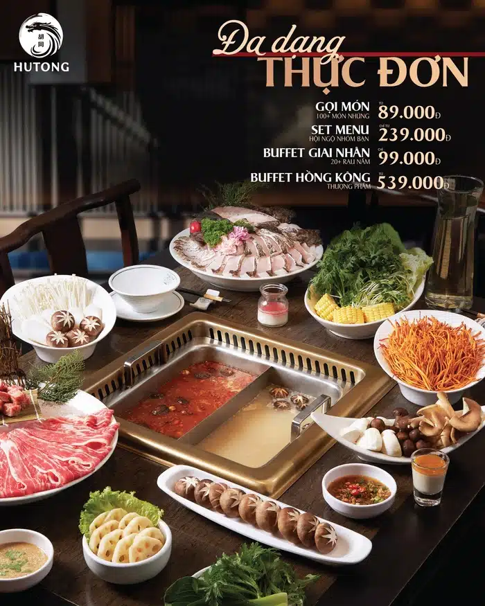 Một số vị lẩu đặc trưng tại HUtong mà bạn nên thử qua như: Lẩu Cay Hồng Kông, Lẩu Sâm Bổ Dưỡng, Lẩu Mã Lai cùng với 5 nhóm món nhúng gồm nấm, rau, thịt viên, mì & đậu. Ngoài ra, quán còn có: Phá Lấu Dồi Trường, Bò Mỹ Brisket, Bẹ Vai Bò Mỹ Chuck Flat, Phá Lấu Khăn Lông Bò, Thịt Gà Ướp Dầu Mè,…