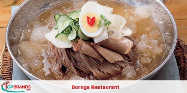 Tô mì ở đây có phần nhân thịt đầy đặn hơn nhiều quán mì trộn tại Hà Nội khác cùng nước dùng béo ngậy vẫn giữ được hương vị ngọt đậm đà vốn có của món ăn xứ kim chi này. Giá một bát mì lạnh tại Bornga Restaurant có giá khá cao, nhưng với một người sành ăn đang tìm kiếm một nơi để thỏa mãn khẩu vị khó tính của mình thì bỏ ra 180.000/bát để đổi lấy sự hài lòng là rất xứng đáng.