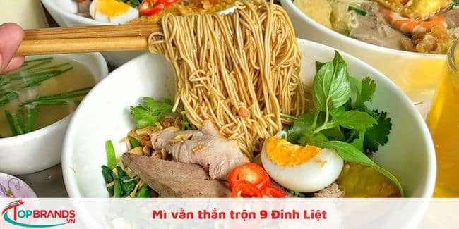 Tại quán có mì hoành thánh nước truyền thống và mì hoành thánh trộn rất ngon. Mì dùng ở quán là sợi mì trứng, sợi mảnh dai dai và sủi cảo đầy ắp nhân bên trong, thịt xá xíu đậm đà, miếng trứng luộc, cải ngọt, hẹ xanh và còn có cả tôm tươi bóc vỏ. Mì được nêm rất vừa miệng, mỗi bát mì trộn sẽ được rưới một loại nước sốt màu nâu óng ánh tự làm khá lạ nhưng rất thơm và ngon. Miếng xá xíu mềm thơm, tôm to, hoành thánh chiên to, cắn vào rất giòn thơm, miếng gan bùi bùi. Không chỉ vậy, cải ngọt còn giúp cho món mì của quán Mì vằn thắn trộn 9 Đinh Liệt thêm độc đáo và có vị ngọt tự nhiên.