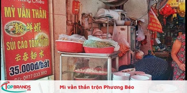 Mì hoành thánh trộn của quán Phương Béo cũng nằm trong danh sách những quán mì trộn ngon nhất ở Hà Nội. Quán chuyên về mì vằn thắn, để giúp thực khách có thêm nhiều lựa chọn, ngoài mì thông thường, quán còn cung cấp mì thập cẩm để “chống” ngán. Thực khách nào đến đây cũng mê mẩn những sợi mì trứng dai dai của quán Phương Béo khi kết hợp hoành thánh chiên và không chiên, thịt, trứng, tôm.