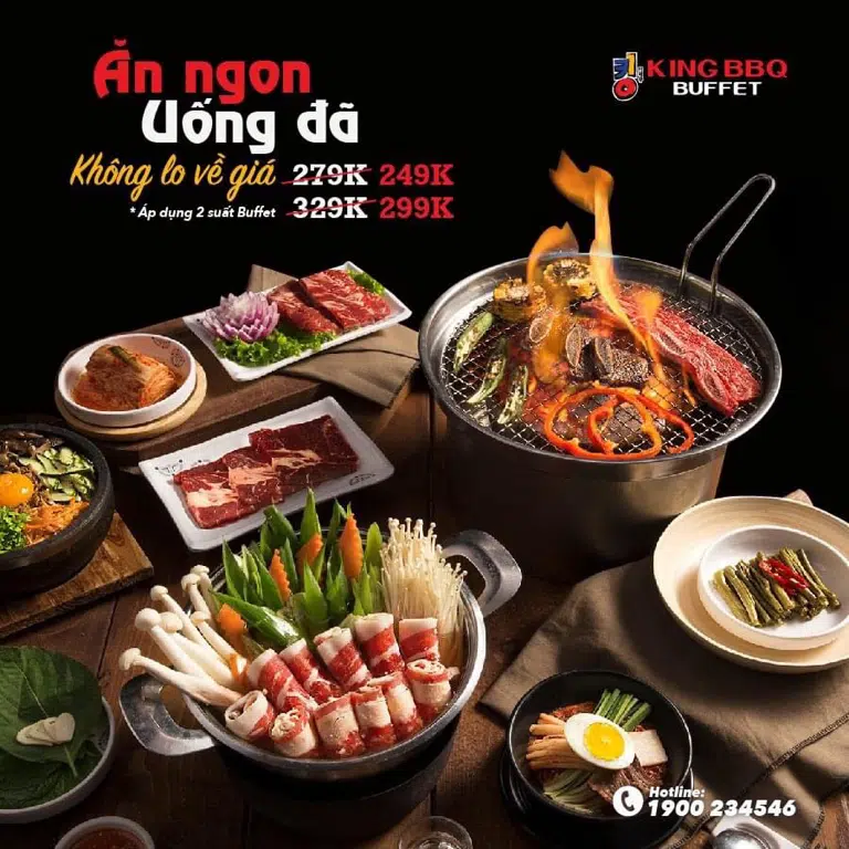 Để được thưởng thức thịt nướng Hàn Quốc đúng “phiên bản gốc” thì đừng bỏ qua chuỗi nhà hàng King BBQ bạn nhé. Tại đây phục vụ cả gọi món và buffet lẩu với hơn 200 món ăn ngon cùng các set combo dành cho nhóm đông người từ 2 – 4 người ăn. Đã đến đây thì đừng bỏ qua món sườn King best seller mà ai cũng ghiền nhé. Trước khi ăn món chính, bạn có thể bắt đầu bằng soup, kimchi salad,…