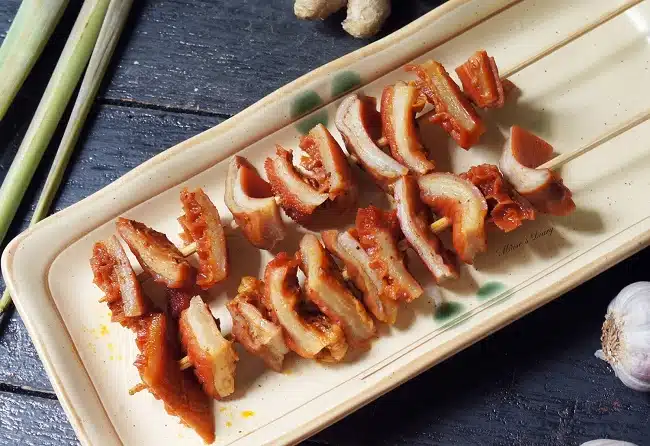 Tuy chỉ là quán ăn vỉa hè nhưng lại khá sạch sẽ, thức ăn được đựng trong dĩa nhựa dùng một lần rồi bỏ. Có phá lấu nướng, gà nướng, mề nướng, cá viên chiên nướng, lòng heo nướng. Tất cả đều được xiên vào từng que nhỏ và mỗi một xiên như thế sẽ có xen hành tây, cải chua, dưa leo nhìn rất đẹp mắt mà lại ngon miệng nữa.