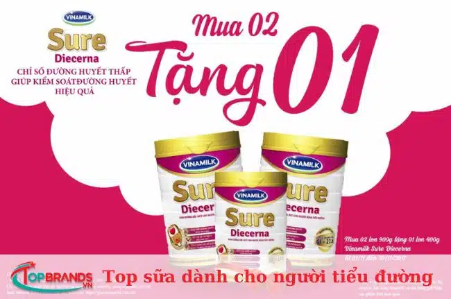 Sữa bột Vinamilk Sure Diecerna sẽ là lựa chọn tiếp theo mà Topbrands muốn giới thiệu đến người đọc. Sữa được Viện Dinh Dưỡng Quốc Gia nghiên cứu và có chỉ số đường huyết thấp GI = 27.6, giúp kiểm soát đường huyết, tăng sức đề kháng, tốt cho hệ tim mạch, giảm tình trạng mệt mỏi của người bệnh và cung cấp 29 khoáng chất và vitamin thiết yếu.